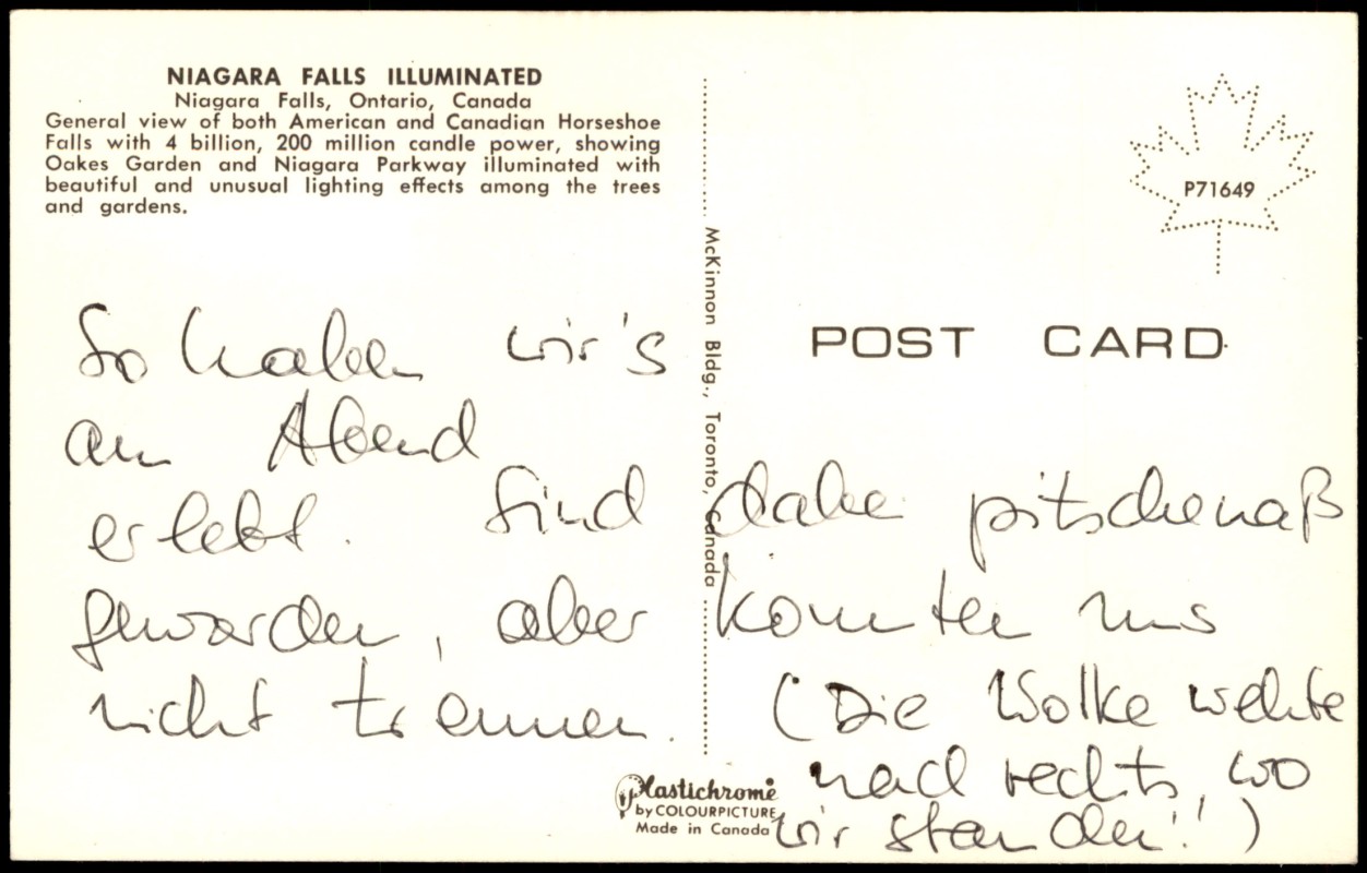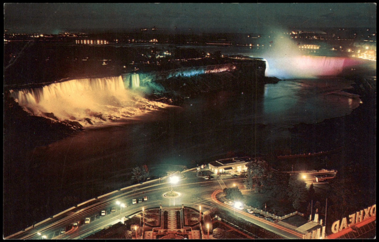 - Farbbild-Postkarte mit einer Nachtaufnahme der beleuchteten Niagarafälle in Ontario, Kanada. Die Ansicht umfasst sowohl die American Falls als auch die Canadian Horseshoe Falls. Im Vordergrund sind der beleuchtete Oakes Garden und der Niagara Parkway zu sehen. Laut rückseitigem Text wurde die Szenerie mit einer Lichtstärke von 4,2 Milliarden Kerzenstärken illuminiert. Hergestellt von Colourpicture (Plastichrome), Toronto/Canada.