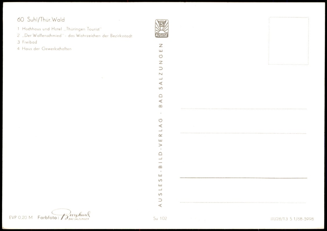 you can buy this card here:- Suhl DDR Mehrbild-AK u.a. Hochhaus, Hotel Thüringen, Waffenschmied, Freibad 1968