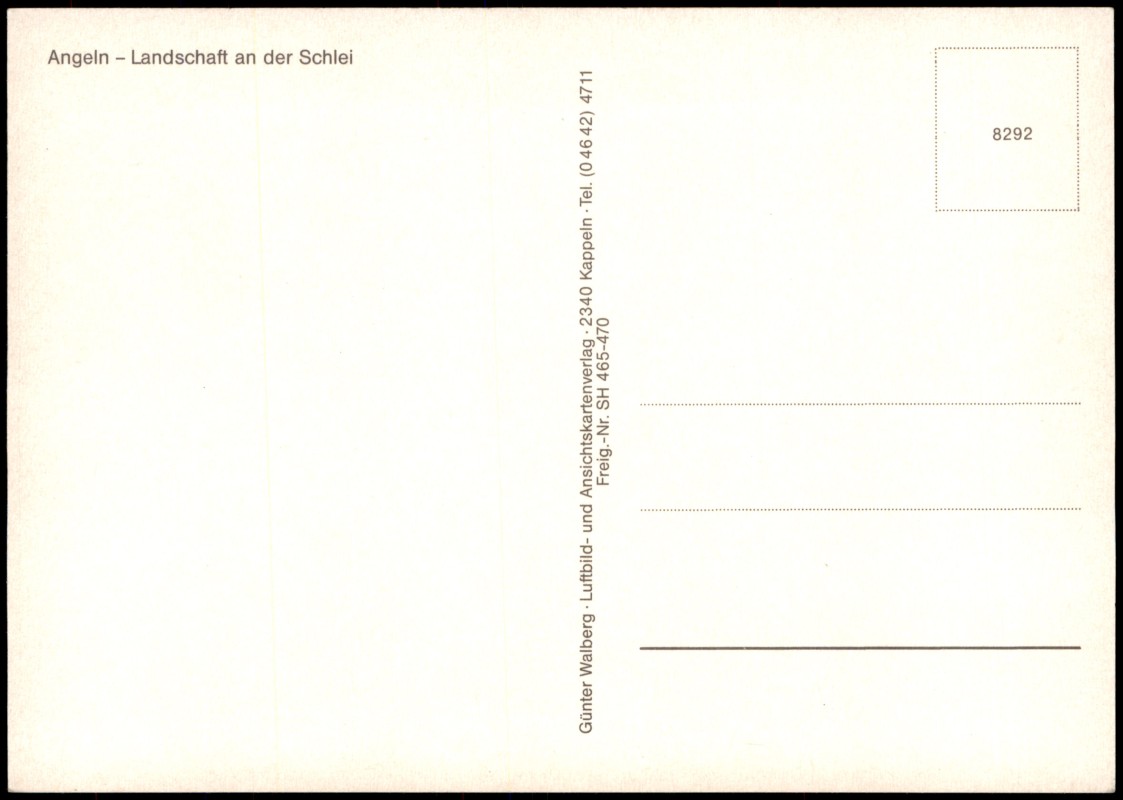 - Farbfoto-Mehrbildkarte mit vier Ansichten aus der Landschaft Angeln an der Schlei. Gezeigt werden: Eine Hafenansicht von Kappeln mit der St. Nikolai-Kirche, ein Zug der Angelner Museumsbahn mit Dampflokomotive, eine Luftaufnahme der Schleibrücke Lindaunis sowie die Personenfähre in Arnis.