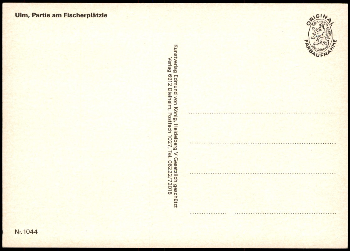 - Farbfotografie des Fischerplätzle im historischen Fischerviertel von Ulm. Die Ansicht zeigt markante Fachwerkhäuser und einen belebten Platz, auf dem offensichtlich ein Markt (evtl. Flohmarkt oder Kunsthandwerk) stattfindet. Herausgegeben vom Kunstverlag Edmund von König, Heidelberg/Dielheim.