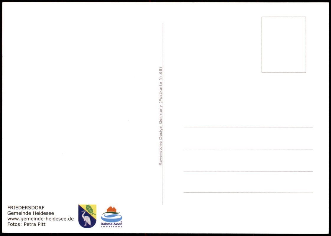 - Moderne Mehrbildpostkarte von Friedersdorf (Gemeinde Heidesee). Die Motive zeigen oben links die Dorfkirche, mittig das Gebäude der Gemeindeverwaltung ('Gemeinde Heidesee') und rechts ein weiteres saniertes Gebäude. Unten sind ein Feld mit Heuballen, ein Porträt einer Ziege sowie das örtliche Kriegerdenkmal abgebildet. Die Fotografien wurden von Petra Pitt erstellt. Die Karte entstand in Kooperation mit Dahme-Seen Tourismus.