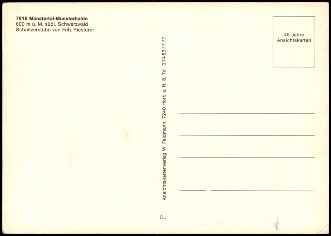 - Mehrbildkarte der 'Schnitzerstube' von Fritz Riesterer in Münstertal-Münsterhalde (600 m ü. M., südl. Schwarzwald). Die sieben Teilansichten zeigen: Detailreiche Holzschnitzereien an Schränken und Türen (u.a. Hirschmotiv), die Außenansicht des Hauses mit dem Torbogen 'Zurück zur Natur', eine Innenansicht mit Kachelofen und Schnitzereien, Fritz Riesterer bei der Arbeit an der Werkbank, eine Gruppe von Kaninchen sowie eine kleine Kapelle in der Landschaft.