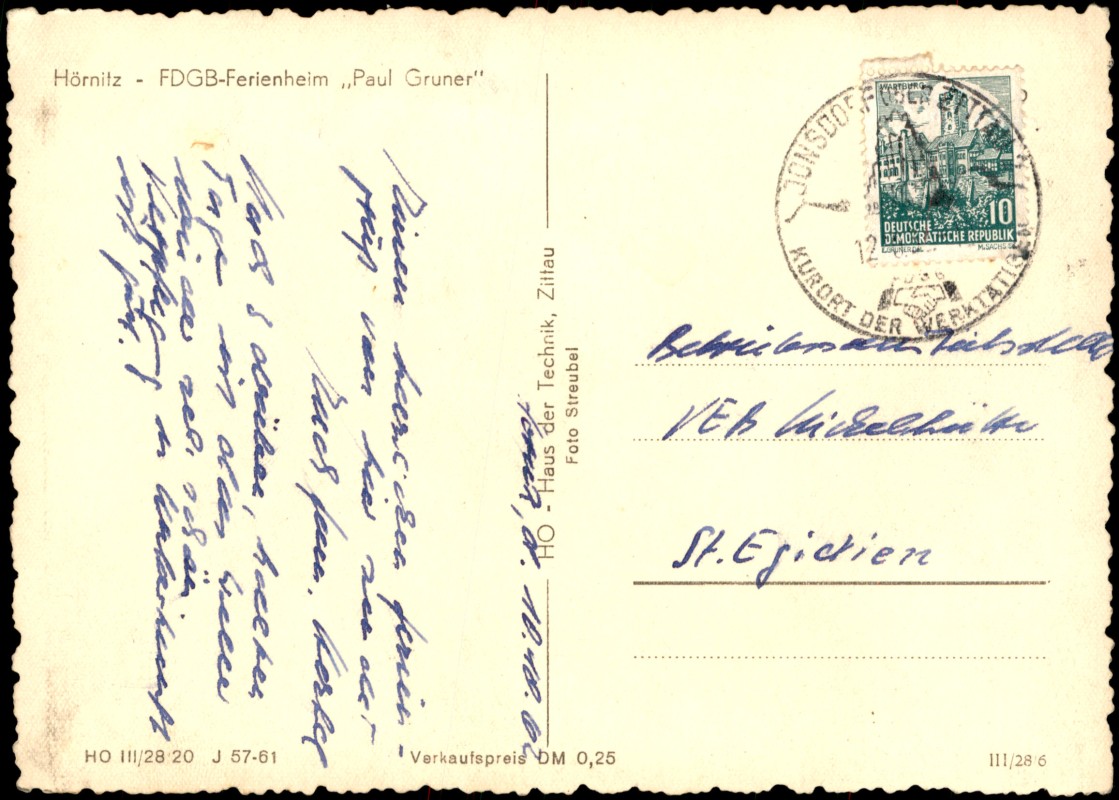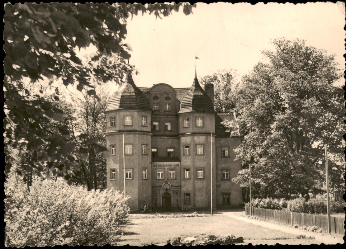 - Schwarz-weiß Fotografie des FDGB-Ferienheims 'Paul Gruner' in Hörnitz (Sachsen), untergebracht im Schloss Hörnitz. Die Ansicht zeigt die markante Fassade des Schlosses mit den zwei Rundtürmen. Foto von Foto Streubel, Zittau. Herausgegeben vom HO-Haus der Technik, Zittau.