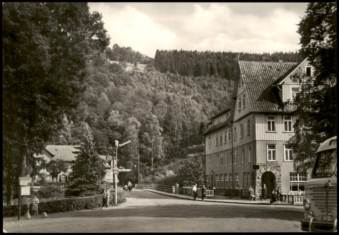 - Schwarz-Weiß-Fotografie von Treseburg im Harz. Die Aufnahme zeigt ein markantes, mehrstöckiges Gebäude (vermutlich ein Hotel oder eine Pension) an einer Straßengabelung nahe einer Brücke über die Bode. Am rechten Bildrand ist ein Teil eines Omnibusses zu sehen. Im Hintergrund erstrecken sich die bewaldeten Hänge des Harzes. Foto: Diener, Mylau (Vogtl.).