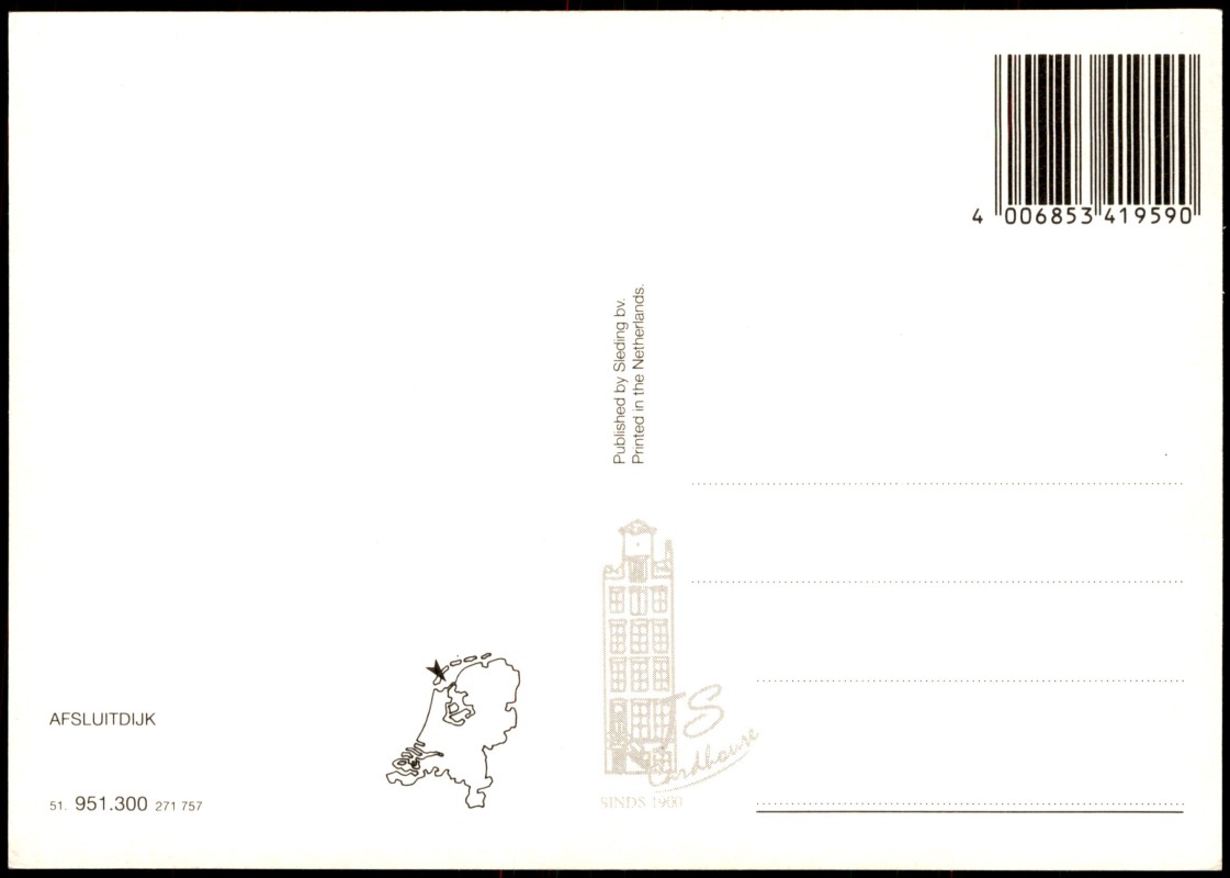 - Farbige Luftaufnahme des Afsluitdijk (Abschlussdeich) in den Niederlanden. Die Ansicht zeigt die Autobahn A7, einen Parkstreifen sowie das markante Vlietermonument mit Aussichtsturm und Steg. Der Deich trennt das IJsselmeer vom Wattenmeer. Auf der Rückseite ist eine kleine Übersichtskarte der Niederlande mit Standortmarkierung sowie das Verlagslogo von Sleding Cardhouse abgebildet.
