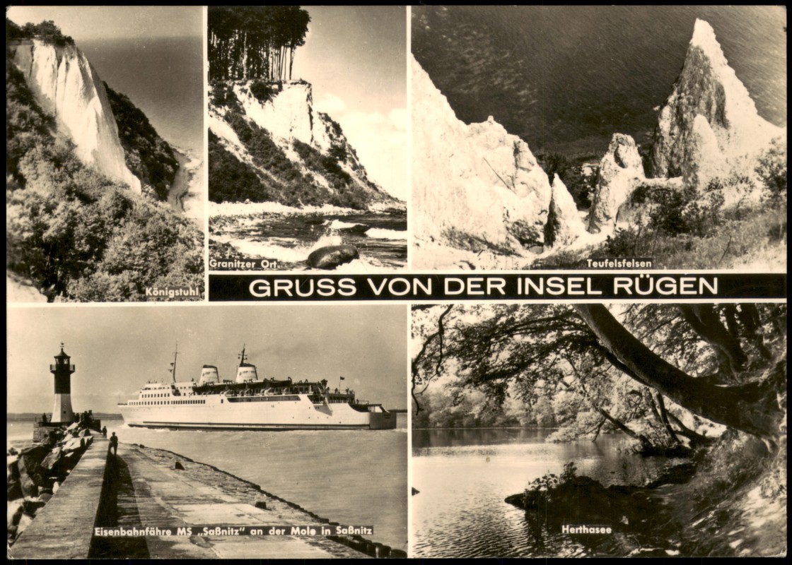 - DDR Mehrbild-AK Insel Rügen mit Küsten-Ansichten und Eisenbahnfähre