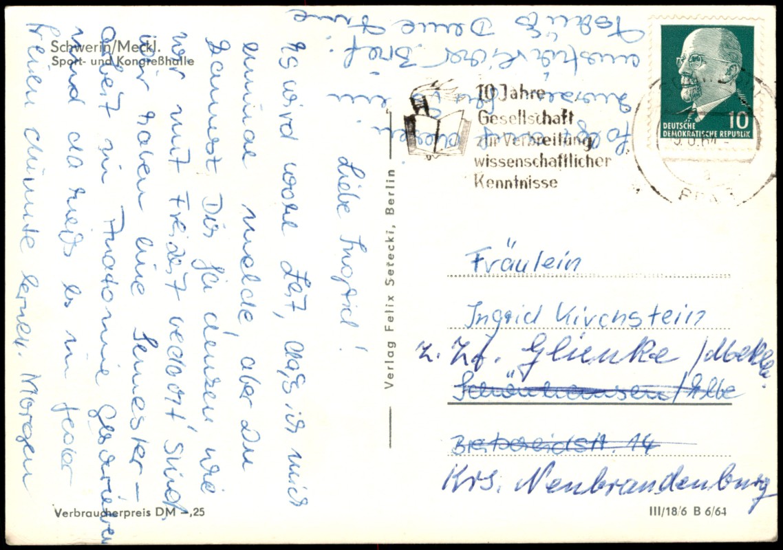- Außenansicht der Sport- und Kongresshalle in Schwerin (Mecklenburg). Die Karte zeigt die moderne Architektur des Gebäudes mit seiner markanten Dachkonstruktion und Glasfassade. Es handelt sich um eine DDR-Ansichtskarte aus den 1960er Jahren.