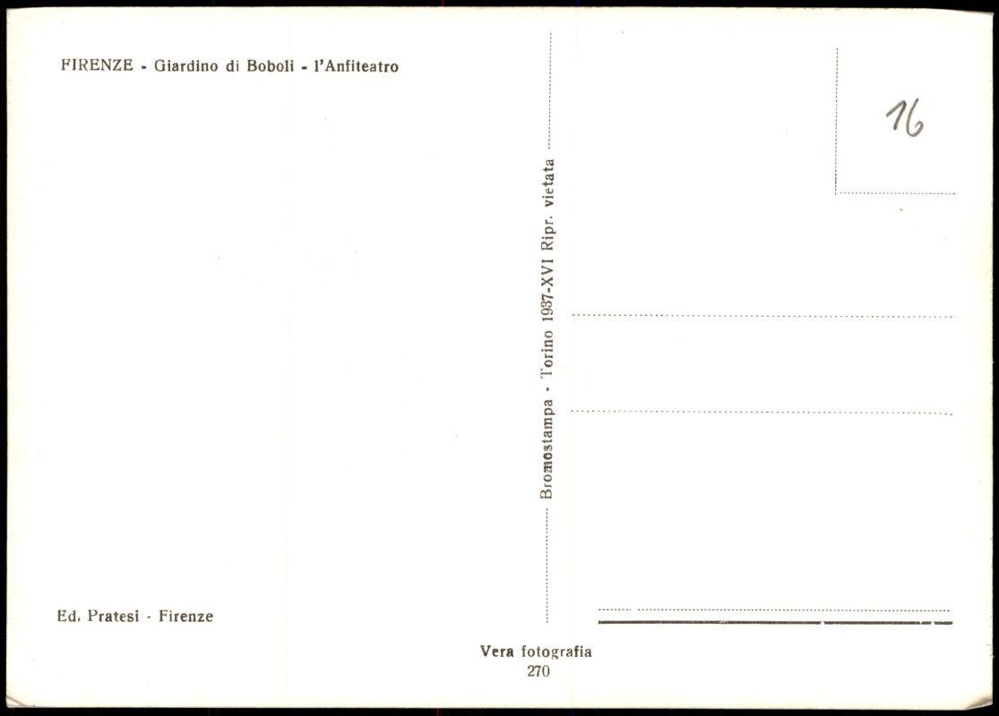 - Echte Fotografie (Vera fotografia) des Amphitheaters im Giardino di Boboli in Florenz. Die Aufnahme zeigt die markante Architektur des Gartentheaters mit seinen terrassierten Sitzreihen, dem zentralen Obelisken und dem Brunnen im Vordergrund. Die Karte wurde von Bromostampa in Turin für den Florentiner Verlag Ed. Pratesi produziert.