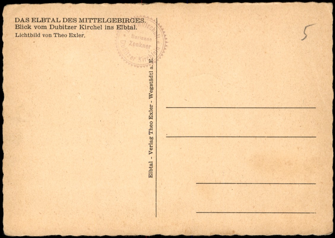 - Echtfoto-Postkarte (Lichtbild) mit einer Panoramaansicht des Elbtals im Mittelgebirge, aufgenommen vom Dubitzer Kirchlein aus. Die Fotografie stammt von Theo Exler. Erschienen im Elbtal-Verlag Theo Exler, Wegstädtl a. E. Die Rückseite enthält einen violetten Namensstempel 'Marianne Zenkner' sowie einen Rundstempel 'Dubitzer Kirchlein'.