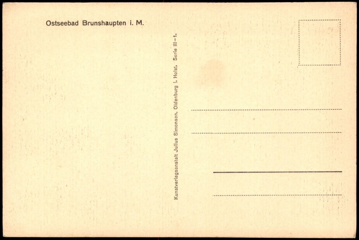 - Stimmungsvolle, künstlerisch gestaltete Ansicht eines einmastigen Segelboots auf offener See unter einem dramatisch bewölkten Himmel. Die Karte ist dem Ostseebad Brunshaupten in Mecklenburg zugeordnet. Erschienen in der Kunstverlagsanstalt Julius Simonsen, Oldenburg i. Holst. als Teil der Serie III-1.
