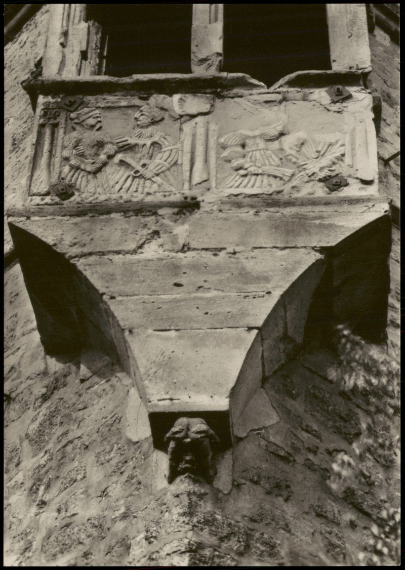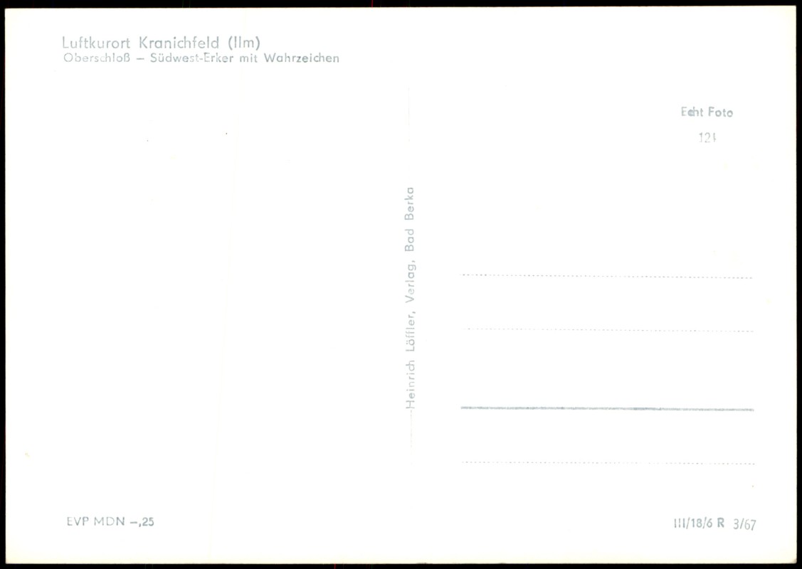 - Echt-Foto-Postkarte mit einer Detailaufnahme des Südwest-Erkers am Oberschloß in Kranichfeld (Ilm). Zu sehen sind die markanten Steinreliefs, die als Wahrzeichen bezeichnet werden. Herausgegeben vom Verlag Heinrich Löffler, Bad Berka.