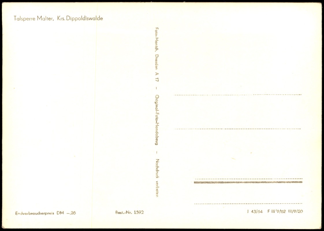- Echte Schwarz-Weiß-Fotografie (Original-Foto-Handabzug) als Mehrbildkarte der Talsperre Malter im Kreis Dippoldiswalde. Die Ansicht zeigt fünf verschiedene Motive: eine Gesamtübersicht der Talsperre, Segelboote auf dem Wasser, Uferzonen sowie das Viadukt. Herausgegeben von Foto-Hanich, Dresden A 17.