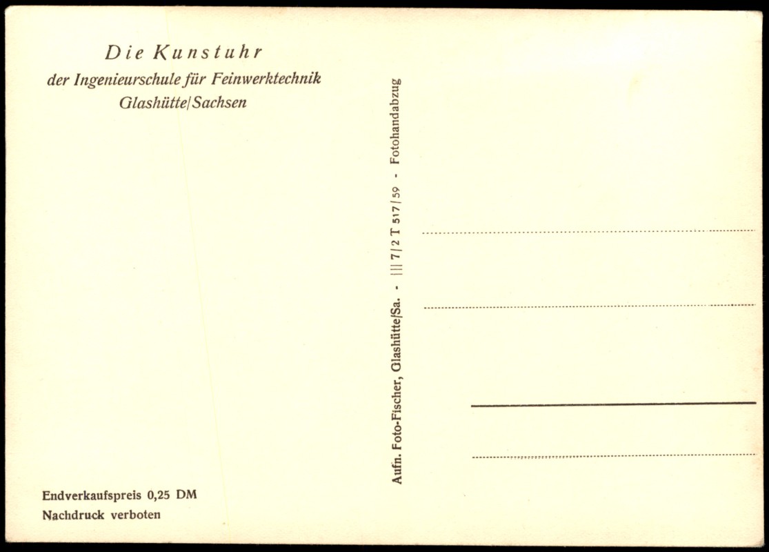 - Echter Fotohandabzug der astronomischen Kunstuhr der Ingenieurschule für Feinwerktechnik in Glashütte, Sachsen. Die Aufnahme von Foto-Fischer zeigt das detailreiche Gehäuse und die komplexen Zifferblätter der Uhr, welche verschiedene astronomische und zeitliche Informationen darstellen. Die Karte weist einen Endverkaufspreis von 0,25 DM aus.