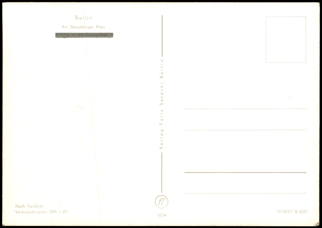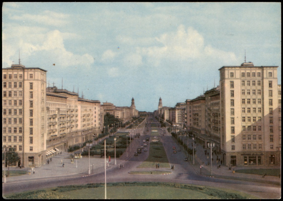 - Farbfotografie des Strausberger Platzes in Berlin (Ost-Berlin). Die Ansicht zeigt die monumentale Architektur im Stil des sozialistischen Klassizismus entlang der damaligen Stalinallee (heute Karl-Marx-Allee). Im Hintergrund sind die markanten Turmbauten des Frankfurter Tors zu sehen. Die Karte wurde laut Druckcode im Juni 1961 produziert.