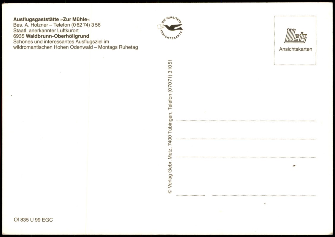 - Mehrbild-Ansichtskarte der Ausflugsgaststätte »Zur Mühle« im staatlich anerkannten Luftkurort Waldbrunn-Oberhöllgrund (Hoher Odenwald). Die Karte zeigt drei Motive: das markante hölzerne Wasserrad der Mühle, eine Außenansicht des Gasthauses mit zeitgenössischen Automobilen (u.a. VW Käfer) sowie den rustikal gestalteten Innenraum der Gaststätte. Als Besitzer wird A. Holzner genannt.