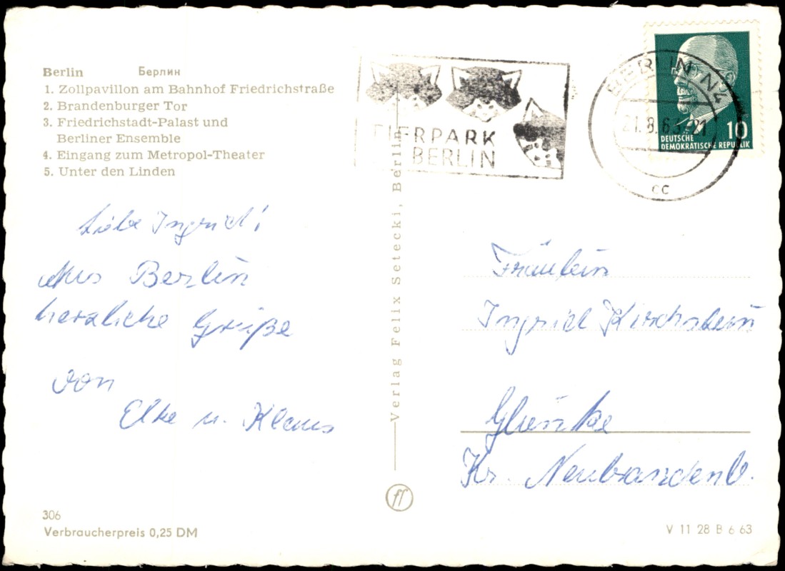 - Schwarz-weiß-Mehrbildkarte mit fünf Ansichten aus Berlin (Ost): 1. Zollpavillon am Bahnhof Friedrichstraße (Tränenpalast), 2. Brandenburger Tor, 3. Friedrichstadt-Palast und Berliner Ensemble, 4. Eingang zum Metropol-Theater, 5. Unter den Linden. In der Mitte der Karte befindet sich das Wappen von Berlin mit dem Schriftzug 'Hauptstadt Berlin'.