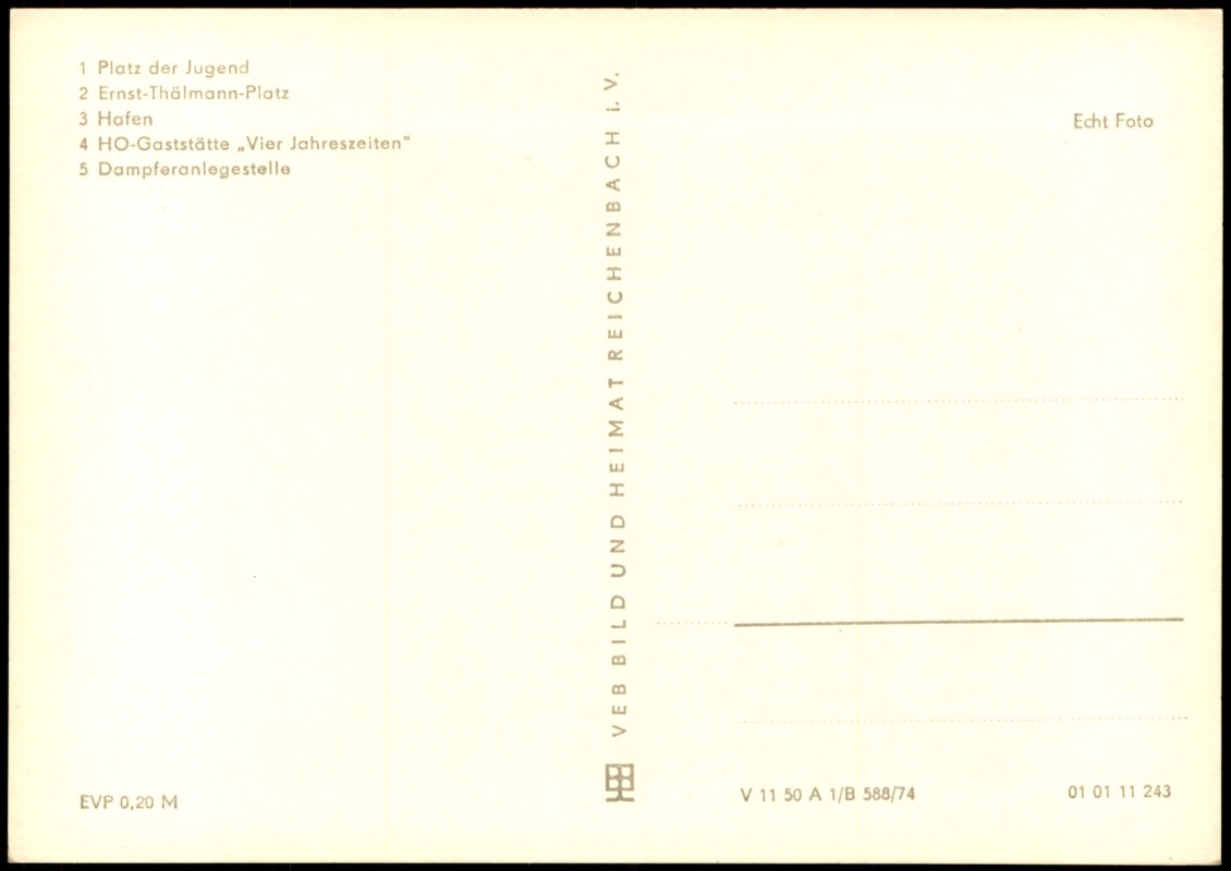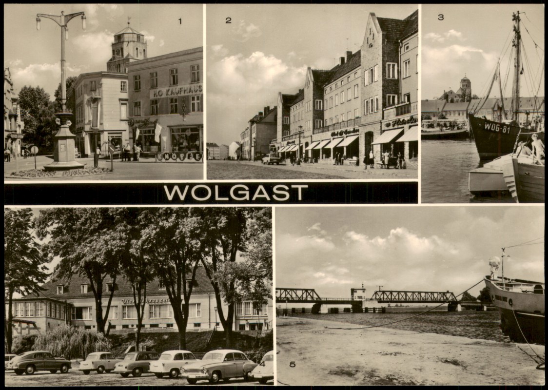 - Echt-Foto-Mehrbildkarte mit fünf Motiven: 1. Platz der Jugend mit dem HO-Kaufhaus, 2. Ernst-Thälmann-Platz mit Ladenzeile, 3. Hafen mit dem Schiff 'WOG-81', 4. HO-Gaststätte 'Vier Jahreszeiten' mit davor geparkten DDR-Fahrzeugen (u.a. Wartburg 353 und Trabant 601), 5. Dampferanlegestelle mit Blick auf die Peenebrücke.