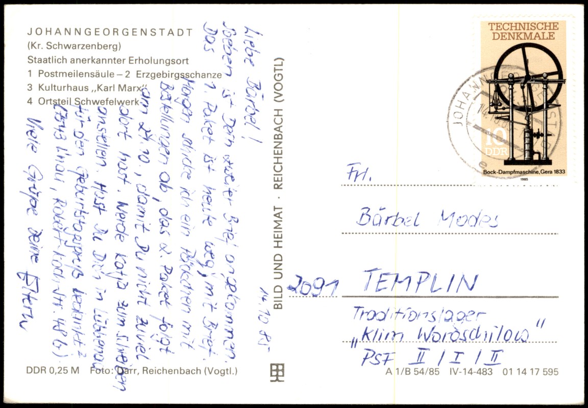 - Mehrbildpostkarte aus Johanngeorgenstadt (Erzgebirge) mit vier Ansichten: 1. Kursächsische Postmeilensäule, 2. Erzgebirgsschanze (Skisprungschanze), 3. Kulturhaus 'Karl Marx', 4. Panorama-Ansicht des Ortsteils Schwefelwerk. Die Karte wurde als staatlich anerkannter Erholungsort beworben. Foto: Darr, Reichenbach (Vogtl.).