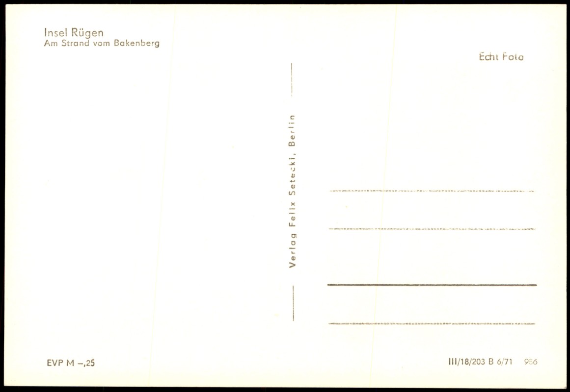 - Echt-Foto-Ansichtskarte vom Strand am Bakenberg auf der Insel Rügen. Die Aufnahme zeigt eine sommerliche Szene in den Dünen: Im Vordergrund ist ein aufgestelltes Campingzelt zu sehen, während im Hintergrund eine Gruppe von Personen am Sandstrand Ball spielt. Die Karte trägt den DDR-Preisaufdruck 'EVP M-,25'.