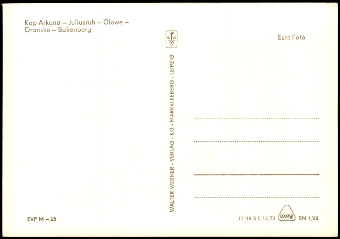 - Echt-Foto-Mehrbildkarte mit fünf Ansichten von der Insel Rügen. Die Motive zeigen die Steilküste am Kap Arkona, eine Ortsansicht (vermutlich Juliusruh oder Glowe) sowie verschiedene Strandabschnitte mit Strandkörben und Badegästen in den Gebieten Juliusruh, Glowe, Dranske und Bakenberg. Die Karte wurde in der DDR vom Walter Werner Verlag produziert.