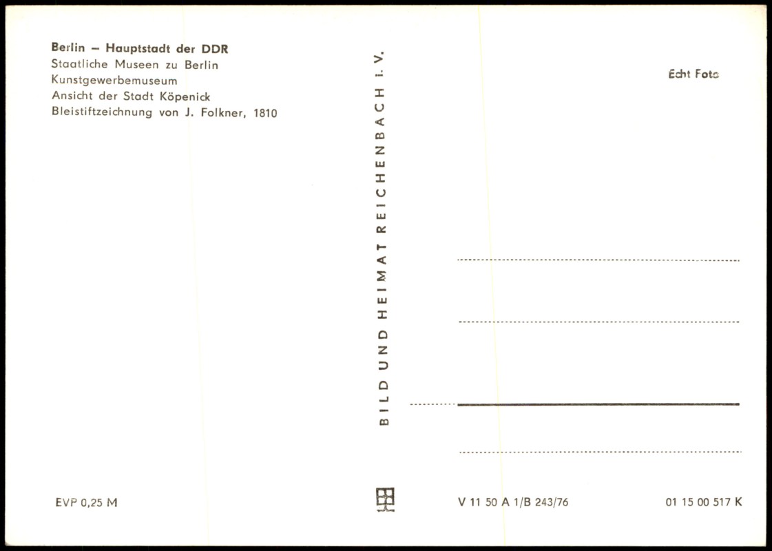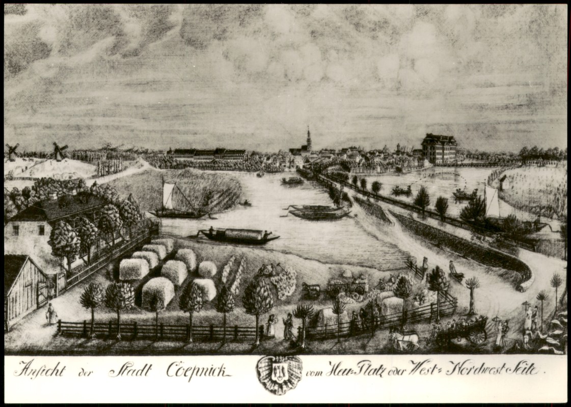 - Reproduktion einer Bleistiftzeichnung von J. Folkner aus dem Jahr 1810. Die Ansicht zeigt die Stadt Köpenick (heute ein Ortsteil von Berlin) von der West-Nordwest-Seite, gesehen vom Har-Platz. Im Vordergrund sind ländliche Szenen und Boote auf dem Wasser zu sehen, im Hintergrund die Silhouette der Stadt mit Kirchturm und Windmühlen. Herausgegeben von den Staatlichen Museen zu Berlin (Kunstgewerbemuseum).