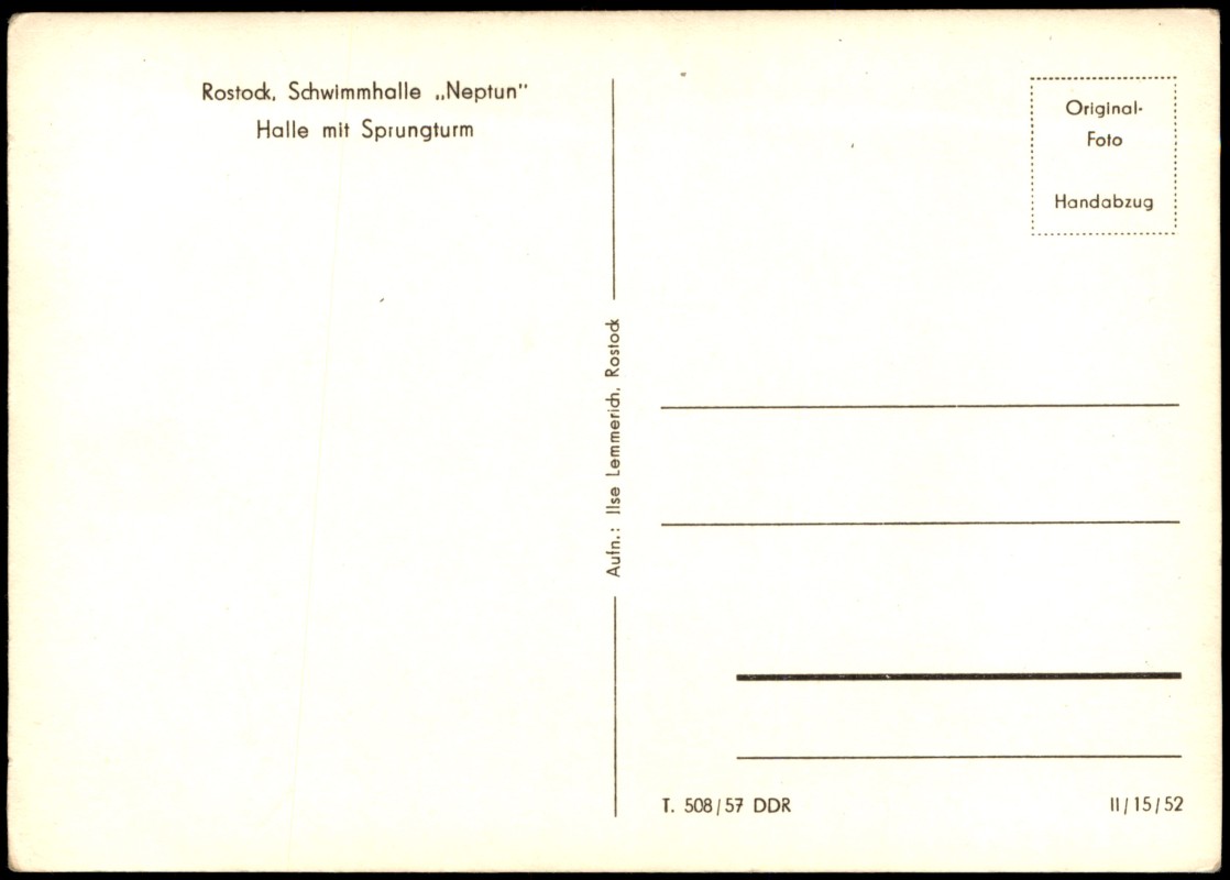 - Innenansicht der Schwimmhalle 'Neptun' in Rostock. Die Fotografie zeigt das leere Schwimmbecken mit markierten Bahnen, den markanten Sprungturm im Hintergrund sowie die beidseitig verlaufenden Zuschauertribünen. Die Deckenkonstruktion weist große quadratische Oberlichter auf. Es handelt sich um einen Original-Foto Handabzug nach einer Aufnahme von Ilse Lemmerich.