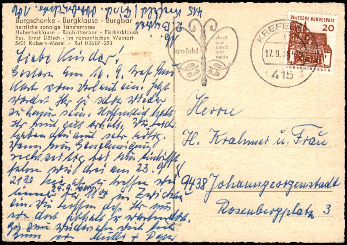 - Farbfotografische Ansicht von Kobern-Mosel mit Blick über den Fluss auf den Ort und die Ruine der Niederburg. Im Vordergrund sind ein weißes Fahrgastschiff sowie eine schwimmende Fischerklause (Hausboot) zu sehen. Ein Textaufdruck oben links bewirbt die Gastronomiebetriebe von Ernst Dötsch, darunter die Burgschenke, Burgklause, Burgbar, Hubertusklause, Raubritterbar und Fischerklause.