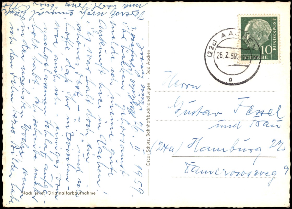 - Farbige Mehrbildkarte mit acht verschiedenen Ansichten der Stadt Aachen. Dargestellt sind unter anderem der Aachener Dom, das Rathaus, der Elisenbrunnen, der Puppenbrunnen sowie verschiedene Park- und Straßenansichten. In der Mitte befindet sich der gedruckte Schriftzug 'Aachen KAISER-UND BADESTADT'. Die Rückseite weist auf eine Originalfarbaufnahme hin.