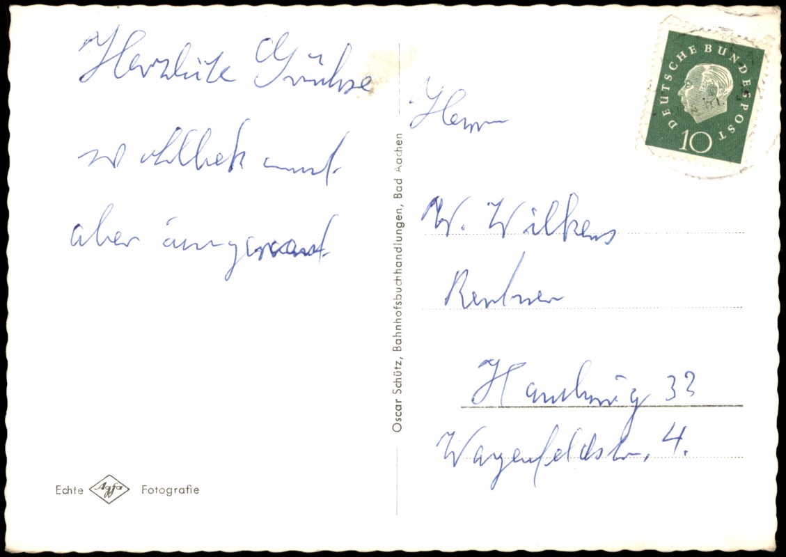 - Echte Fotografie (Agfa) als Mehrbildkarte von Bad Aachen. Die Karte zeigt fünf Einzelansichten: den Kaiser-Karl-Brunnen, den Elisenbrunnen, das Kurhaus, den Aachener Dom und das Ponttor. Herausgegeben von Oscar Schütz, Bahnhofsbuchhandlungen, Bad Aachen.