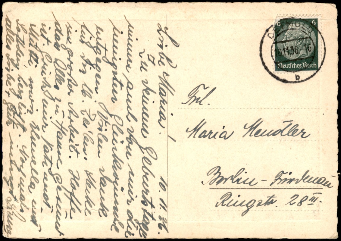 - Schwarz-Weiß-Fotografie des Landestheaters in Detmold. Die Aufnahme zeigt die klassizistische Fassade des Gebäudes mit seinem markanten Portikus, der von sechs korinthischen Säulen getragen wird. Im Giebel ist die Inschrift 'LEOPOLD IV.' zu erkennen, was auf den Bauherrn Fürst Leopold IV. zur Lippe hinweist. Das Foto wurde von Paul Beckmann aufgenommen.