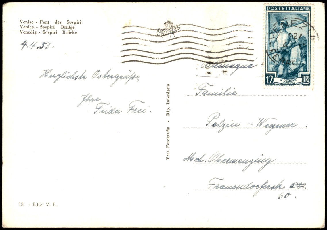 - Kolorierte Echtfotografie der berühmten Seufzerbrücke (Ponte dei Sospiri) in Venedig. Die Aufnahme zeigt die Brücke, die den Dogenpalast mit dem neuen Gefängnis verbindet, über dem Rio di Palazzo. Im Vordergrund ist eine Gondel auf dem Kanal zu sehen. Die Karte enthält mehrsprachige Bildunterschriften in Italienisch, Französisch, Englisch und Deutsch.