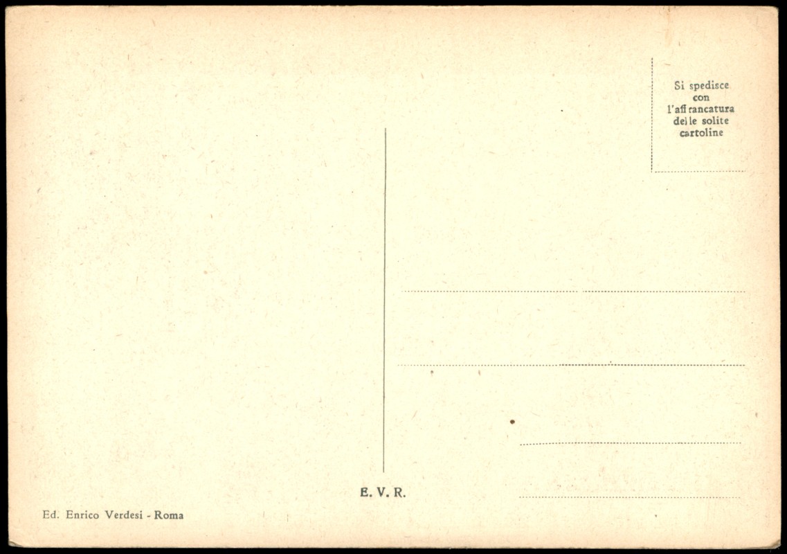 - Schwarz-Weiß-Fotografie mit einer Panorama-Ansicht des Foro Mussolini (heute Foro Italico) in Rom. Die Aufnahme zeigt den Gebäudekomplex der ehemaligen Accademia Fascista di Educazione Fisica (heute Sitz der Universität Foro Italico) und im Hintergrund das Stadio dei Marmi. Die Karte wurde vom Verlag Enrico Verdesi herausgegeben.