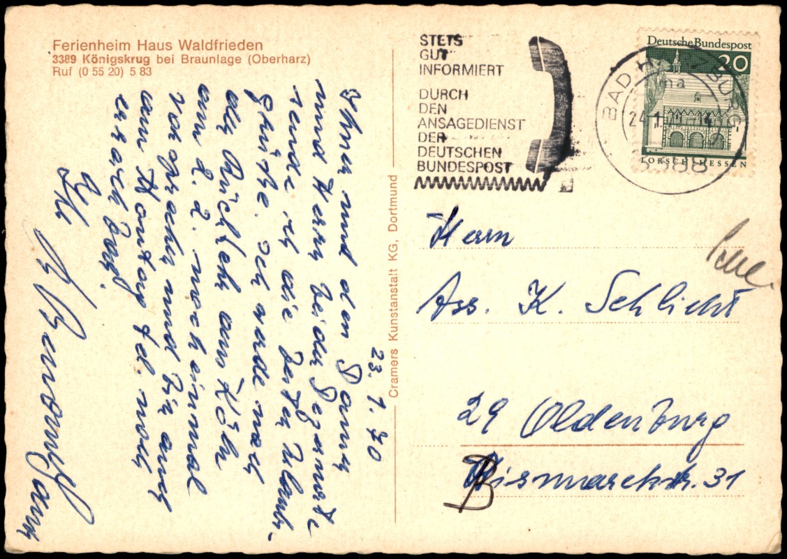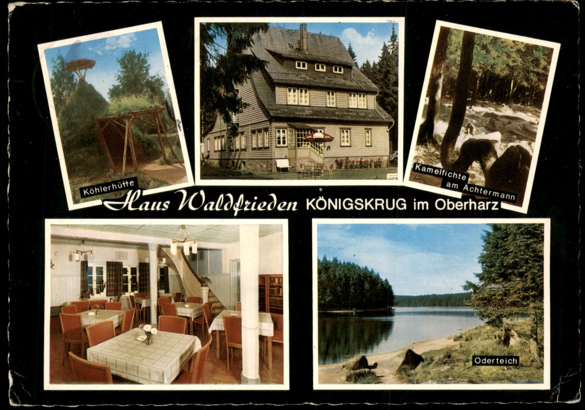 - Mehrbildkarte mit fünf verschiedenen Ansichten aus Königskrug bei Braunlage im Oberharz. Die Motive umfassen eine Außenansicht sowie eine Innenansicht (Gastraum) des Ferienheims 'Haus Waldfrieden', die 'Köhlerhütte', das Naturdenkmal 'Kamelfichte am Achtermann' und eine Landschaftsaufnahme des 'Oderteichs'.