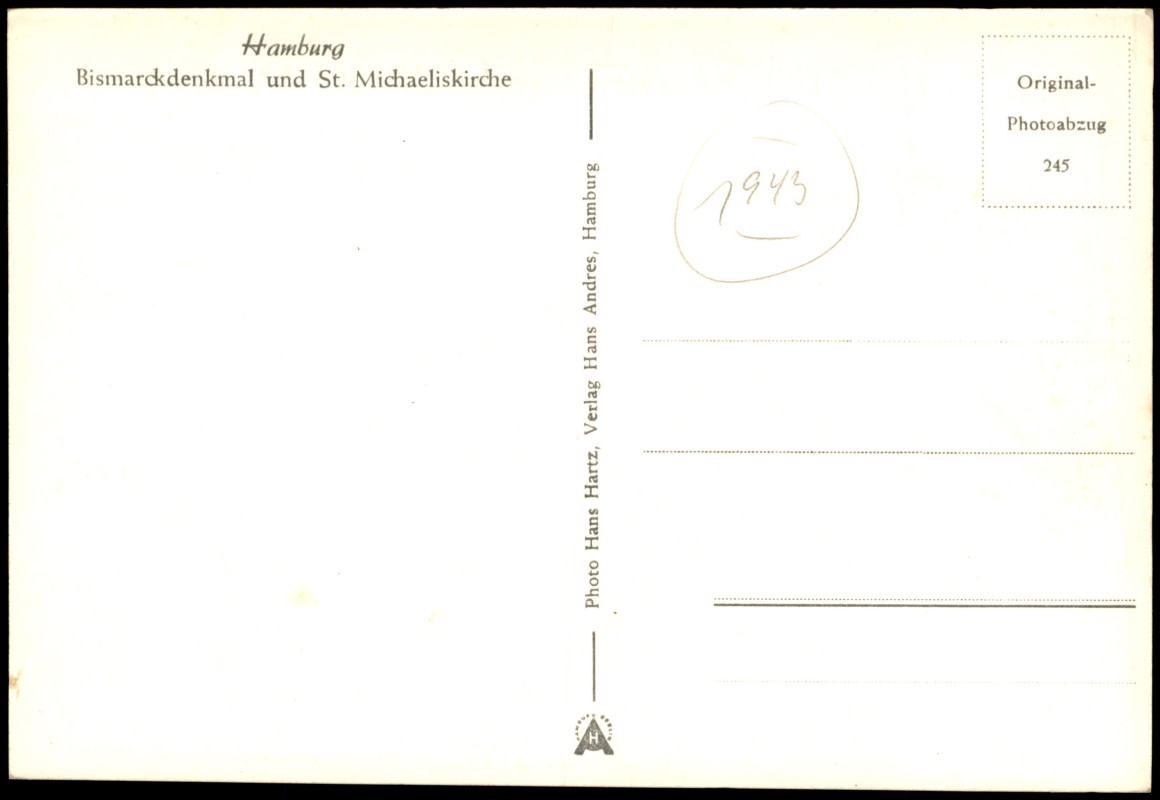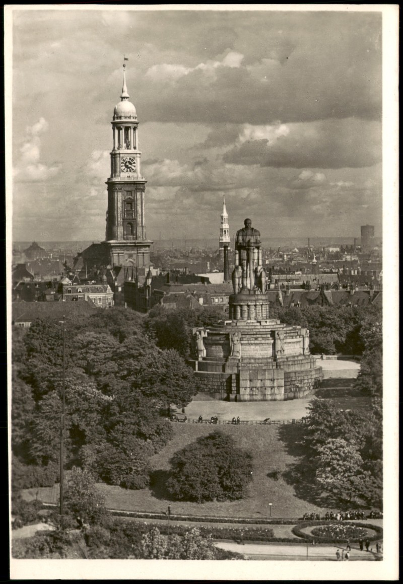 - Echtfoto-Postkarte (Original-Photoabzug) mit einer Ansicht des Bismarckdenkmals im Elbpark und dem markanten Turm der St. Michaeliskirche (Michel) im Hintergrund. Die Fotografie stammt von Hans Hartz.
