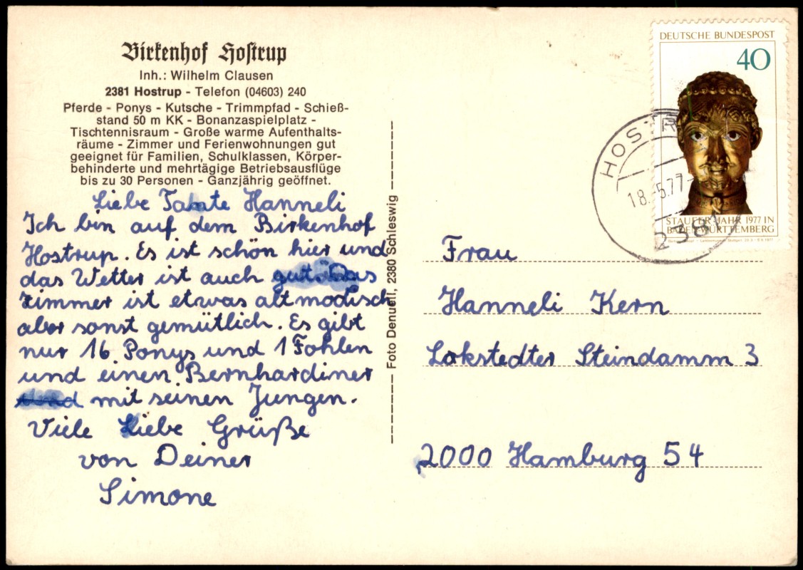 - Mehrbild-Postkarte des Birkenhofs in Hostrup (Inhaber Wilhelm Clausen). Die Vorderseite zeigt fünf verschiedene Ansichten: die Außenansicht des Hauptgebäudes, die Terrasse mit Sonnenschirmen, einen rustikal eingerichteten Aufenthaltsraum sowie Szenen von Freizeitaktivitäten (Ponyreiten und ein Spielplatz mit Klettergerüst). Die Rückseite listet detailliert die Ausstattung auf, darunter Pferde, Ponys, Kutschen, ein Trimmpfad, ein Schießstand (50 m KK) und ein Bonanzaspielplatz. Die Unterkunft wird als geeignet für Familien, Schulklassen und Körperbehinderte beschrieben.