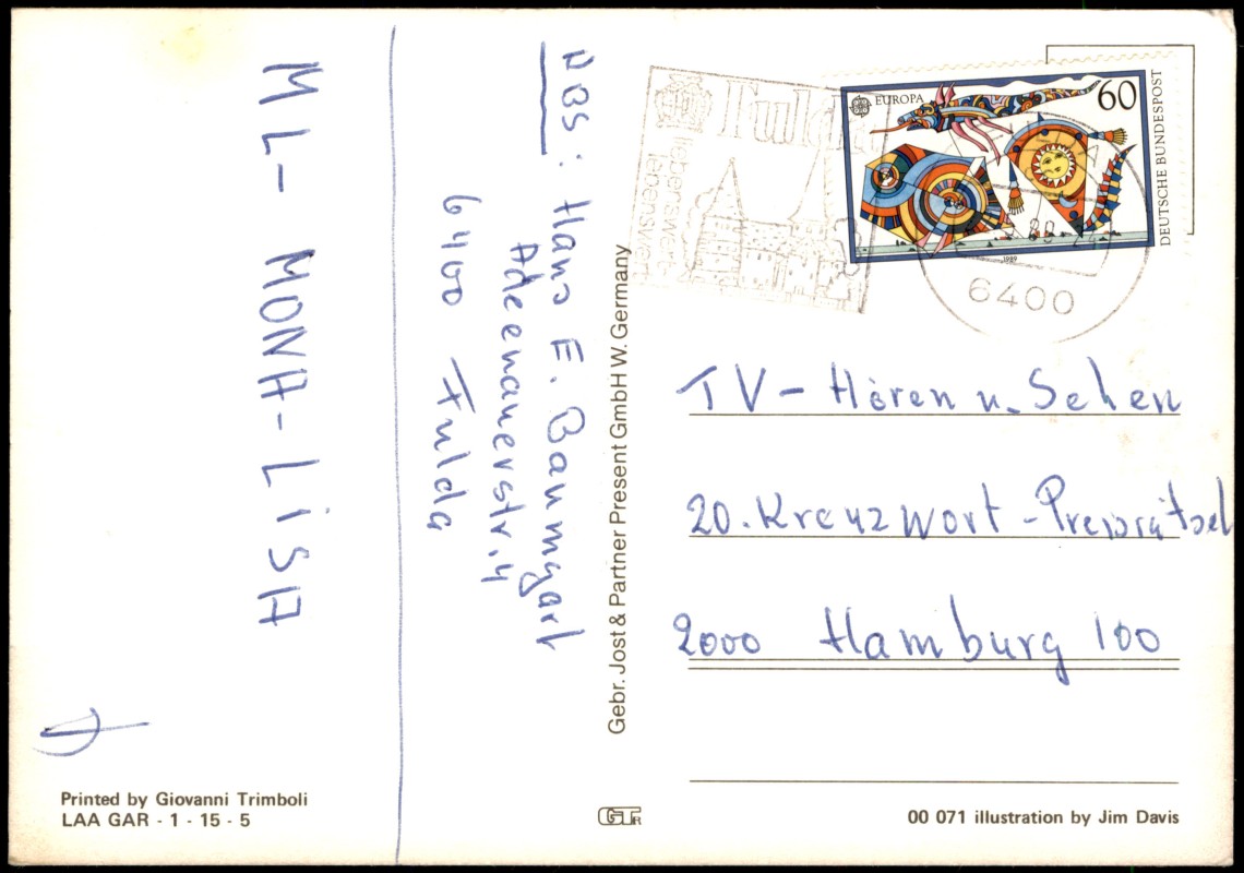 - Comic-Postkarte mit einer Illustration von Jim Davis, die den Charakter Garfield zeigt. Garfield liegt melancholisch auf dem Boden neben einer kleinen weißen Maus, einem Ball und einem Katzenspielzeug. Der Text oben lautet: 'Es gibt nichts Schlimmeres, als keinen Spielgefährten zu haben'. Die Karte wurde von Giovanni Trimboli gedruckt und trägt ein Copyright von 1978 (United Feature Syndicate, Inc.).