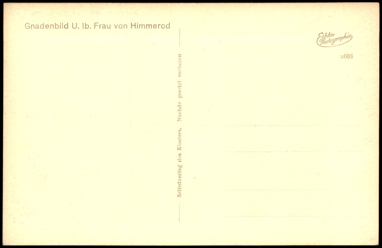 - Echtfoto-Postkarte (Schwarz-Weiß) mit einer Nahaufnahme des Gnadenbildes 'Unserer Lieben Frau von Himmerod'. Dargestellt ist die Gottesmutter Maria, die das Jesuskind im Arm hält. Die Karte wurde im Selbstverlag des Klosters Himmerod herausgegeben.