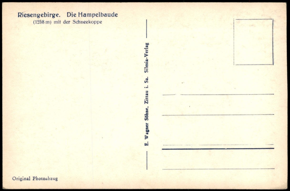 - Originaler Photoabzug einer winterlichen Gebirgslandschaft im Riesengebirge. Im Bildzentrum ist die Hampelbaude (1258 m) zu sehen, im Hintergrund erhebt sich die Schneekoppe. Die Aufnahme zeigt eine verschneite Landschaft mit markanten Frostformationen an den Bäumen im Vordergrund.