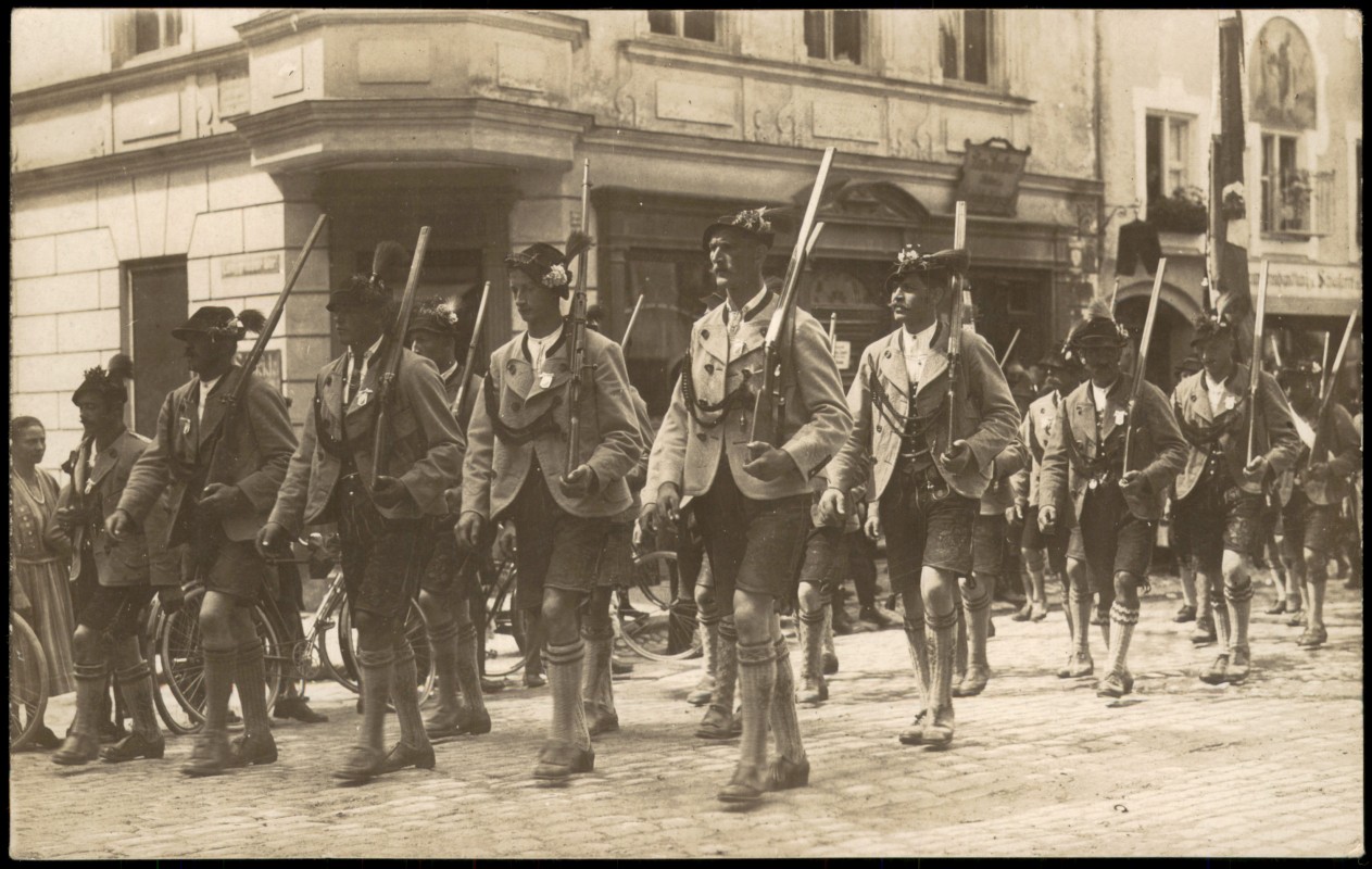 - Gruppe bewaffneter Männer in traditioneller bayerischer Tracht (Lederhosen, Trachtenjachten und Hüte