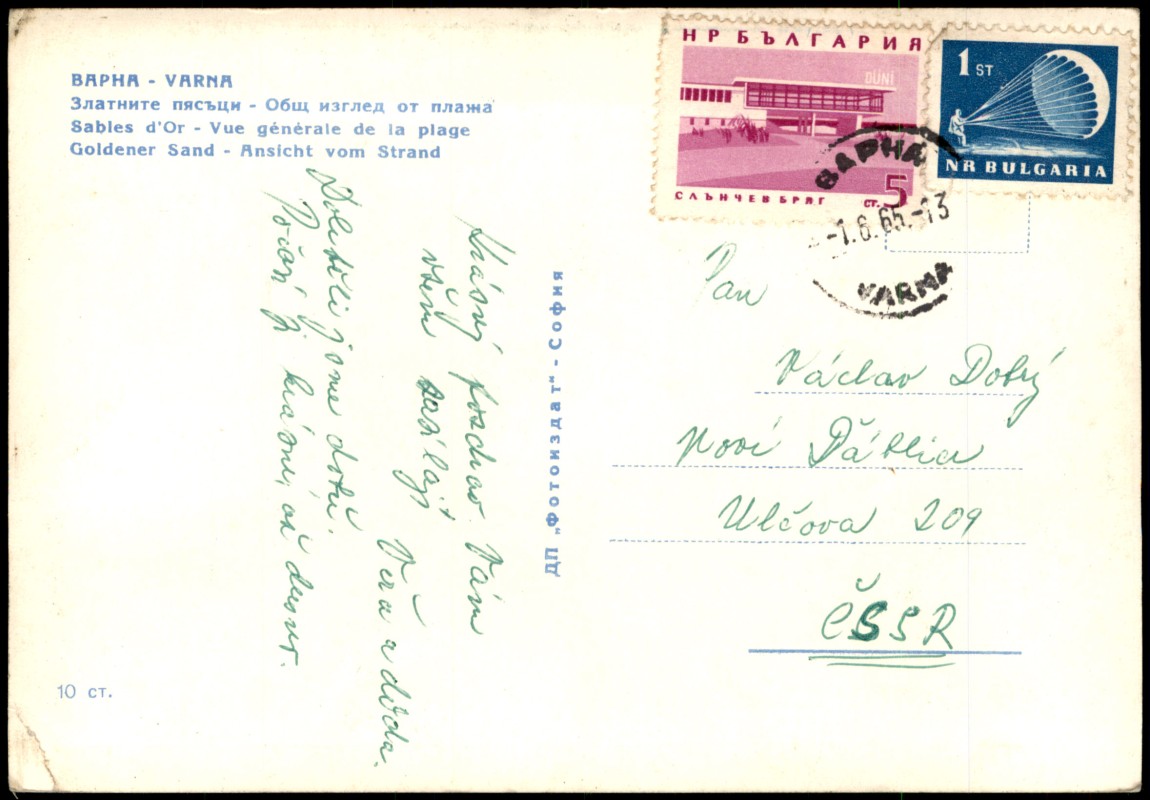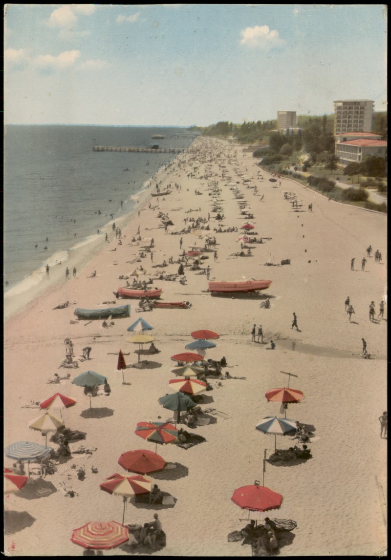 - Farbfotografie mit einer Panorama-Ansicht des Goldstrandes (Zlatni Pyasatsi) bei Warna. Die Aufnahme zeigt einen weiten Sandstrand mit zahlreichen Badegästen, charakteristischen bunten Sonnenschirmen und Rettungsbooten. Im Hintergrund sind moderne Hotelbauten der 1960er Jahre und bewaldete Abschnitte zu sehen. Die Karte ist dreisprachig (Bulgarisch, Französisch, Deutsch) beschriftet.