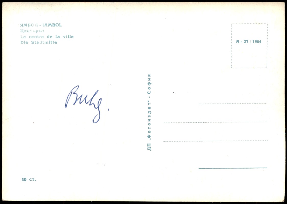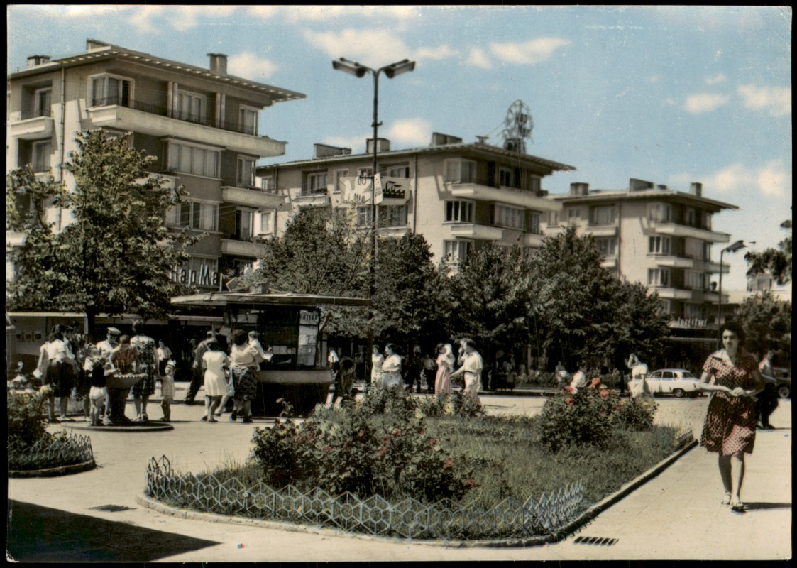 - Mehrfarbige Ansichtskarte der Stadtmitte von Jambol. Die Aufnahme zeigt moderne, mehrstöckige Wohnbauten der 1960er Jahre, eine zentrale Platzanlage mit Blumenbeeten und kleinen Zäunen sowie Passanten. Ein Kiosk und zeitgenössische Straßenlaternen sind ebenfalls sichtbar. Der Text ist mehrsprachig in Bulgarisch, Französisch und Deutsch aufgedruckt.
