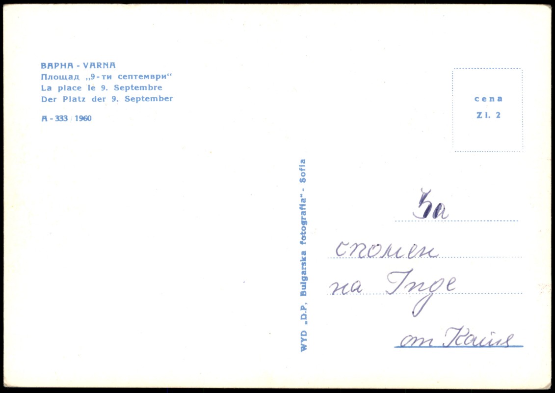 - Mehrfarbige Ansichtskarte des Platzes der 9. September in Warna, Bulgarien. Im Vordergrund steht ein großer, kreisförmiger Springbrunnen in einer Grünanlage. Der weitläufige Platz ist belebt mit Passanten, einem markanten roten Bus und mehreren PKWs. Im Hintergrund sind städtische Gebäude und die Hafenanlagen am Horizont erkennbar. Die Karte enthält gedruckte Bildunterschriften in Bulgarisch, Französisch und Deutsch.
