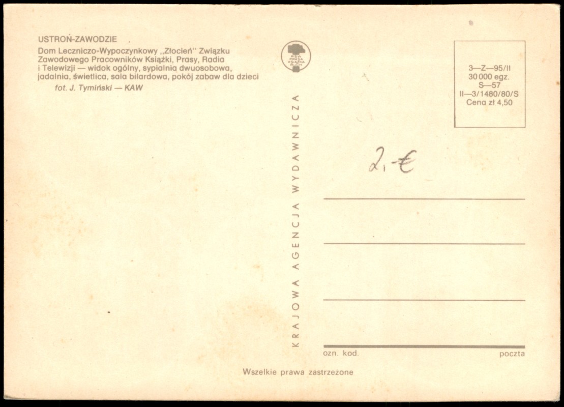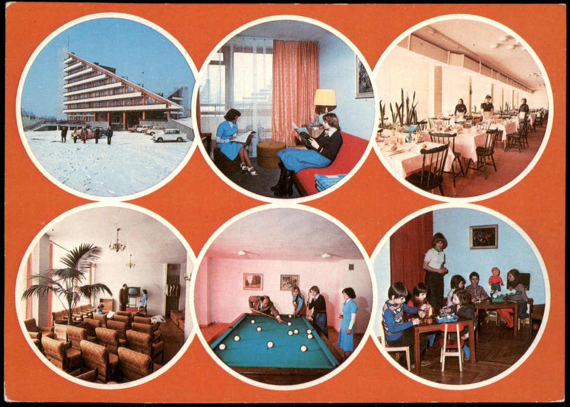 - Mehrbild-Postkarte des Erholungsheims 'Złocień' in Ustroń-Zawodzie, welches vom Gewerkschaftsbund der Buch-, Presse-, Radio- und Fernsehmitarbeiter betrieben wurde. Die sechs kreisförmigen Vignetten zeigen: eine Außenansicht der markanten Pyramiden-Architektur, ein Doppelzimmer, den Speisesaal, den Aufenthaltsraum (Świetlica), das Billardzimmer sowie das Kinderspielzimmer. Die Fotografien stammen von J. Tymiński.