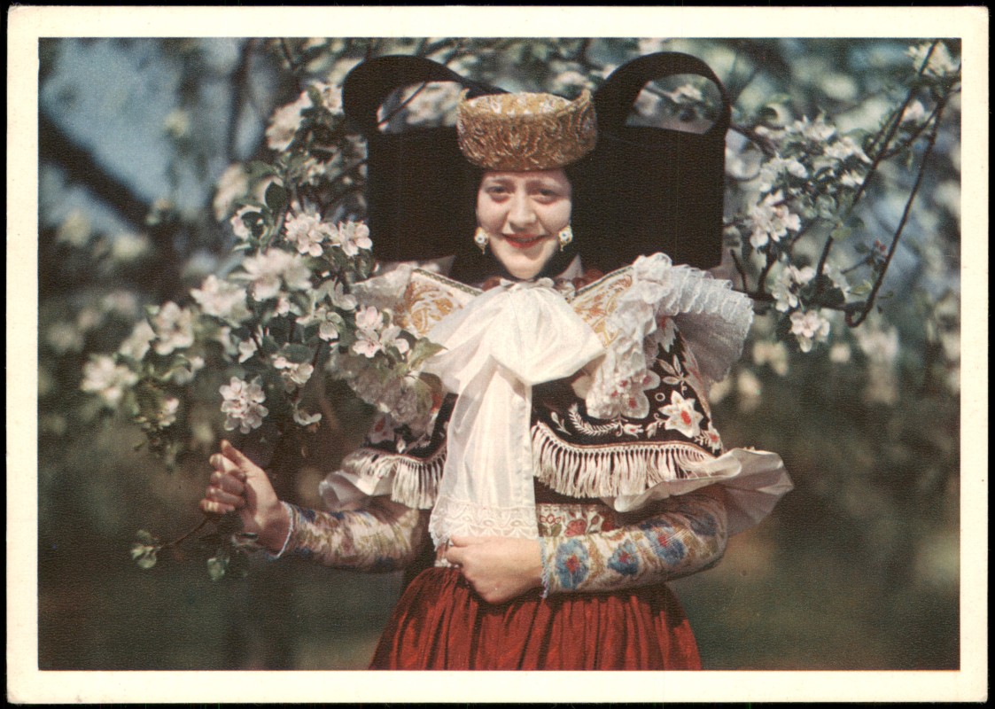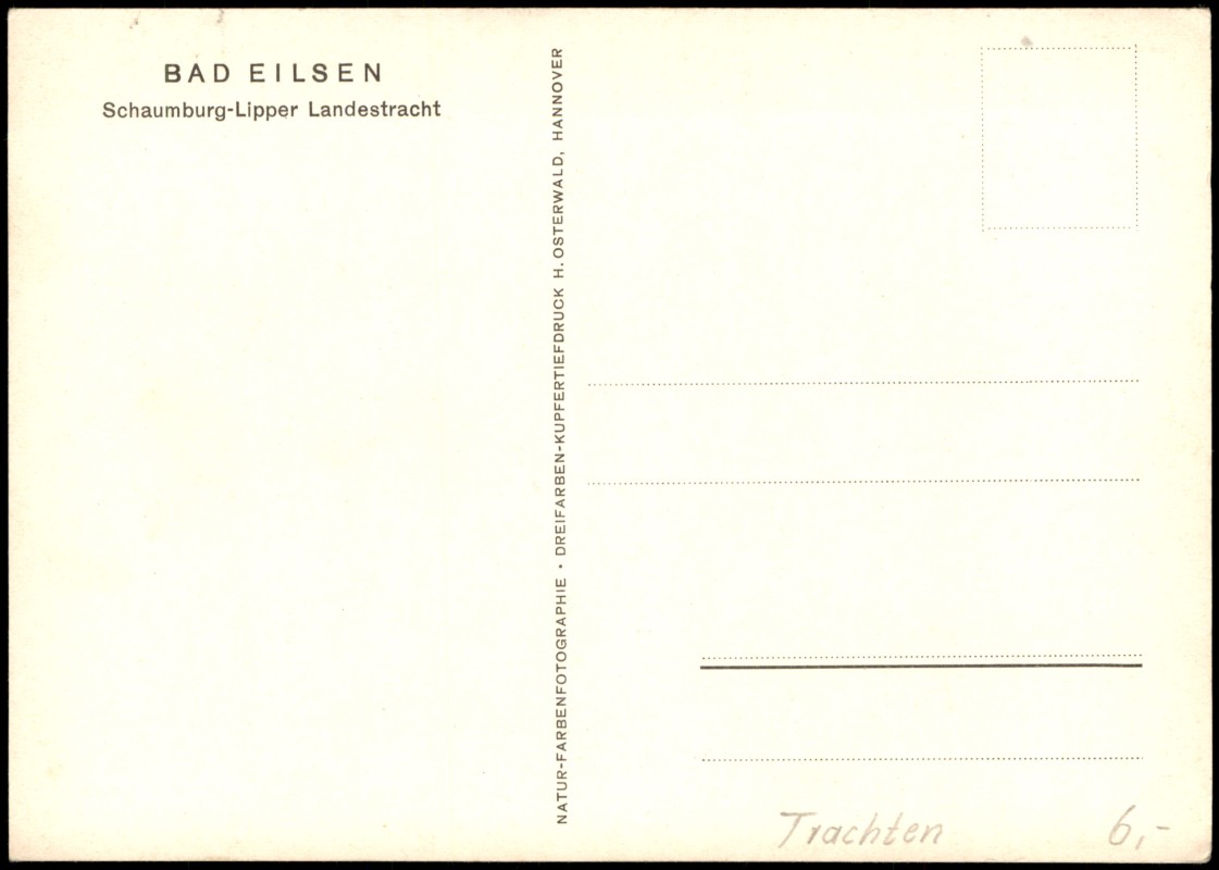- Hochwertige Natur-Farbenfotografie im Dreifarben-Kupfertiefdruck. Dargestellt ist eine Frau in der traditionellen Schaumburg-Lipper Landestracht, erkennbar an der großen schwarzen Flügelhaube und dem bestickten Halstuch. Sie hält einen blühenden Zweig in der Hand, im Hintergrund sind blühende Obstbäume zu sehen. Die Karte wird dem Ort Bad Eilsen zugeordnet.