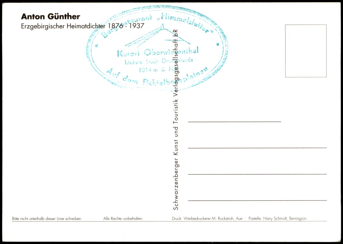- Die Postkarte zeigt ein Porträt von Anton Günther, dem Erzgebirgischen Heimatdichter (1876-1937), umrahmt von malerischen Landschaftsansichten des Erzgebirges. Im Bild sind Noten mit einem Auszug aus seinen Liedtexten 'Mit Gefühl Ver-gaß dei Ha-mit net' integriert. Die Karte wurde von der Schwarzenberger Kunst und Touristik Verlagsgesellschaft bR herausgegeben. Der Druck erfolgte durch die Werbedruckerei M. Rockstroh in Aue, die Pastelle stammen von Harry Schmidt aus Bermsgrün.