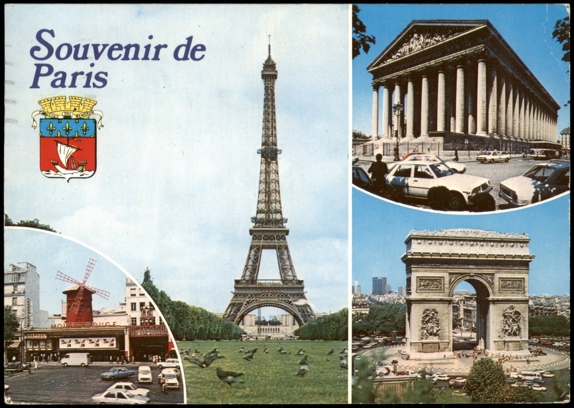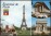 - Eine Ansichtskarte mit dem Titel 'Souvenir de Paris', die eine Collage der bekanntesten Wahrzeichen der Stadt zeigt. Im Zentrum steht der Eiffelturm, umgeben von weiteren Motiven wie dem Moulin Rouge, der Église de la Madeleine und dem Arc de Triomphe. Die Karte wurde vom Verlag Combier Imprimeur Mâcon (CIM) herausgegeben und trägt die Seriennummer 75.056.