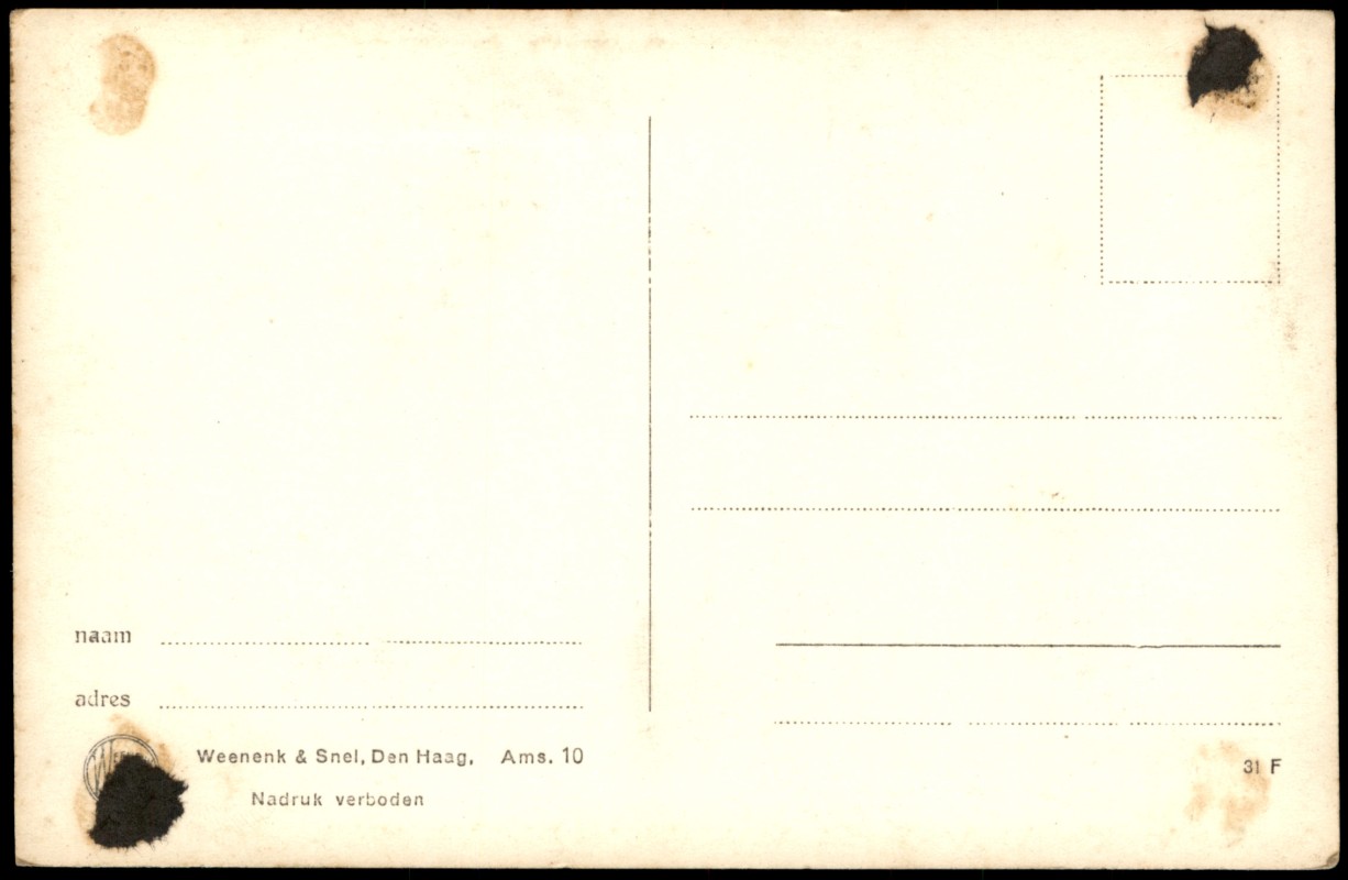 - Historische Panorama-Ansicht der Prinz Hendrikkade in Amsterdam, mit dem prominenten Victoria-Hotel im Vordergrund. Die Szene zeigt belebte Straßen mit Passanten und einer Straßenbahn. Herausgegeben von Weenenk & Snel, Den Haag, Seriennummer Ams. 10. Der Aufdruck 'Nadruk verboden' weist auf das Urheberrecht hin.