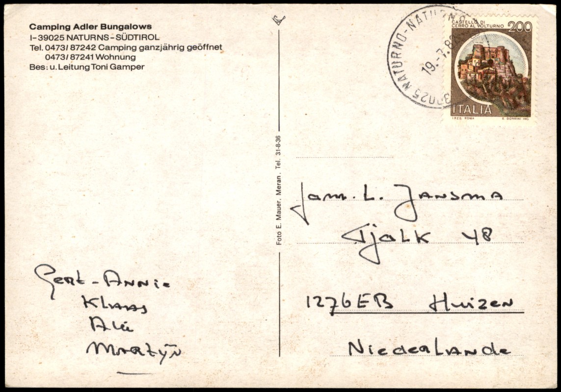- Mehrbildkarte des Campingplatzes Adler in Naturns, Südtirol. Die vier Ansichten zeigen eine Panorama-Übersicht des Platzes mit Wohnwagen, das Hallenbad, die modernen Sanitäranlagen (Waschraum) sowie Bungalows mit Blumenschmuck. Als Besitzer und Leiter wird Toni Gamper genannt. Fotografische Aufnahme von E. Mauer, Meran.
