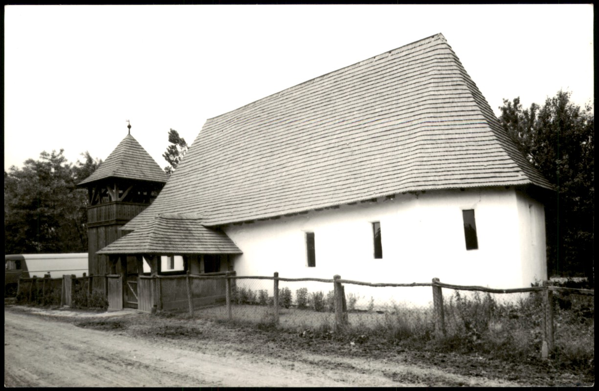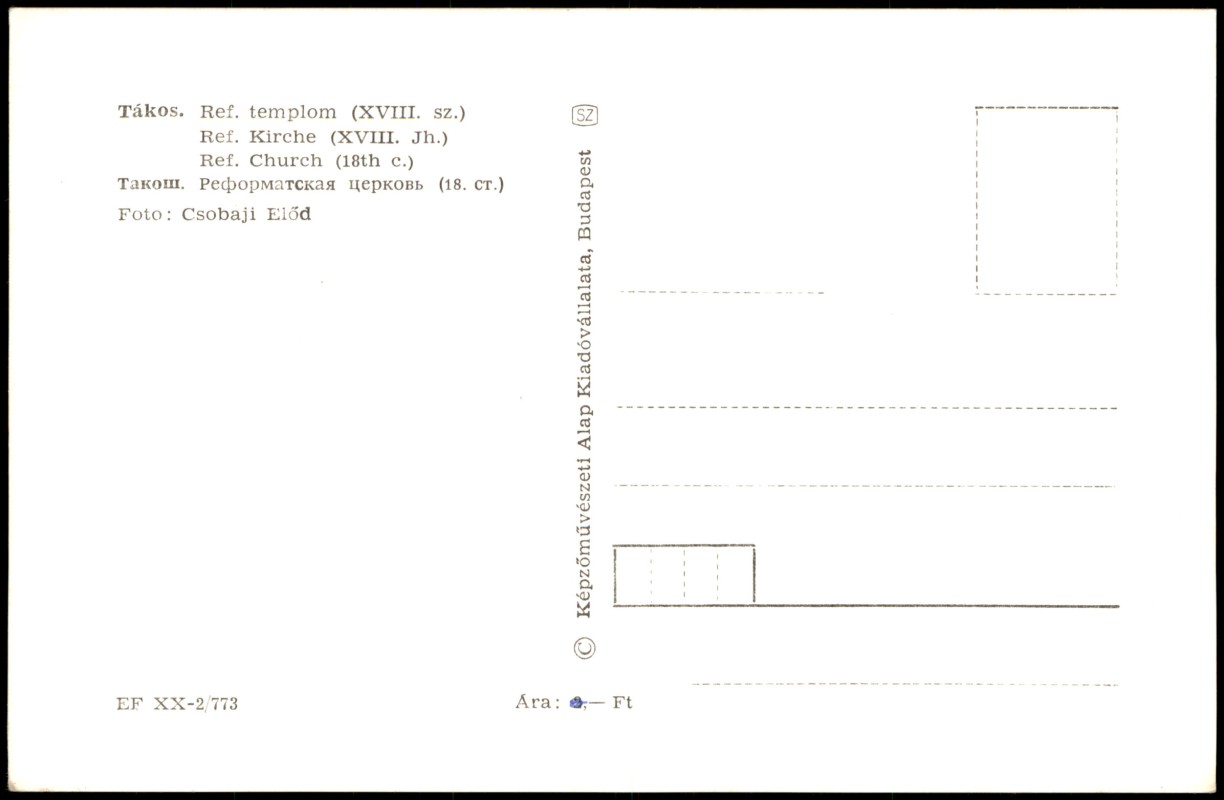 - Schwarz-Weiß-Fotografie der reformierten Kirche (Ref. templom) in Tákos, Ungarn. Das Bauwerk stammt aus dem 18. Jahrhundert und ist für seine Architektur mit dem großen Schindeldach und dem separaten hölzernen Glockenturm bekannt. Die Aufnahme stammt vom Fotografen Csobaji Előd. Herausgegeben vom Kunstfond-Verlag (Képzőművészeti Alap Kiadóvállalata) in Budapest.