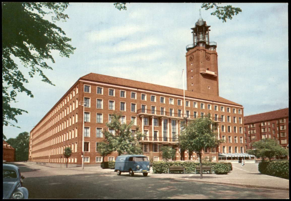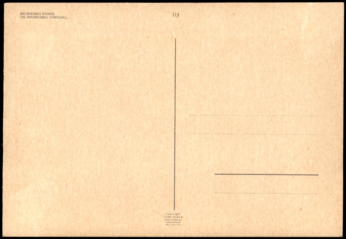 - Farbfotografische Ansicht des Frederiksberg Rådhus (Rathaus von Frederiksberg) in Dänemark. Das monumentale Backsteingebäude mit seinem markanten Uhrturm dominiert die Szene. Im Vordergrund ist ein blauer Volkswagen Transporter (VW T1) sowie ein weiteres Fahrzeug auf der Straße zu sehen. Herausgegeben vom Chr. Olsen Kunstforlag, Kopenhagen.